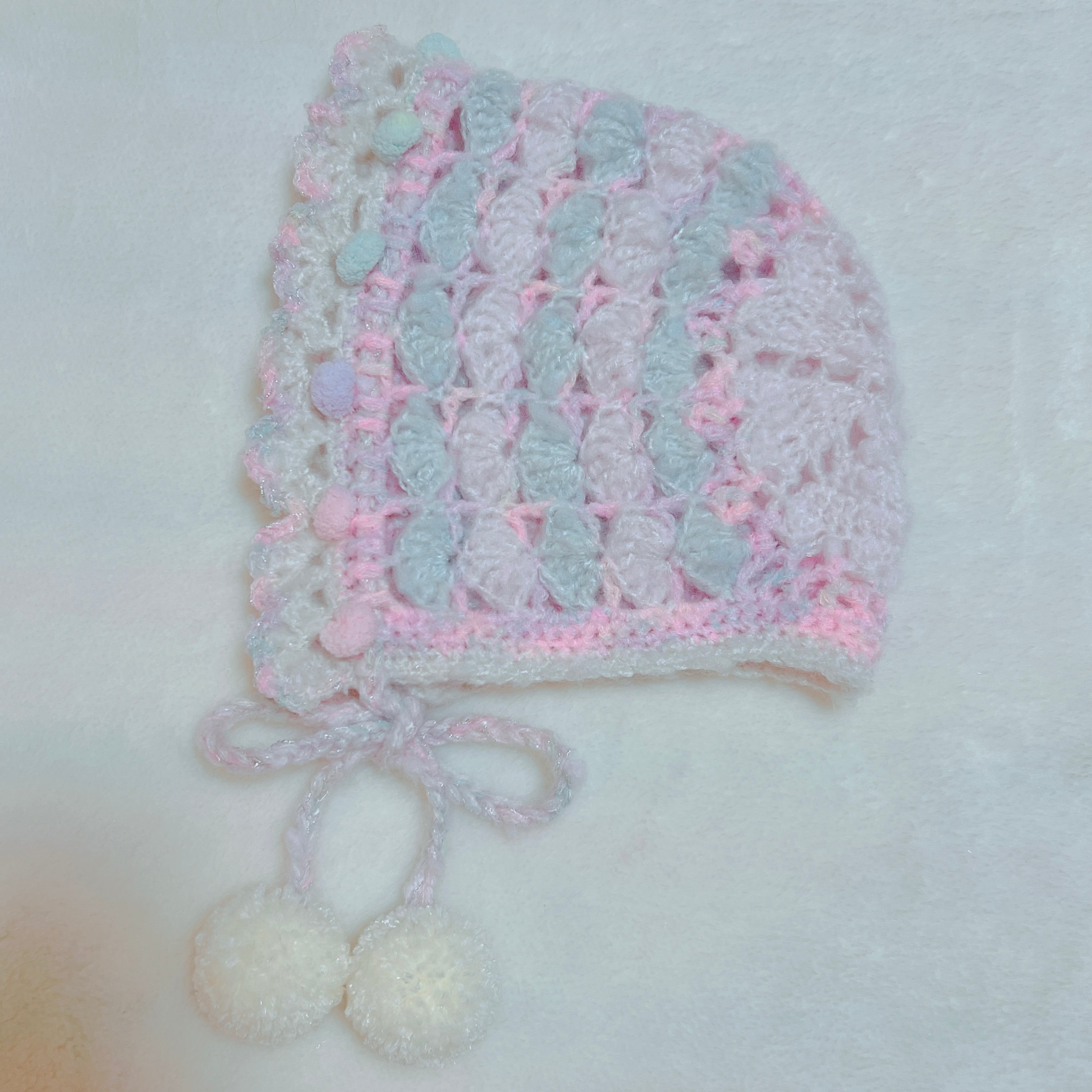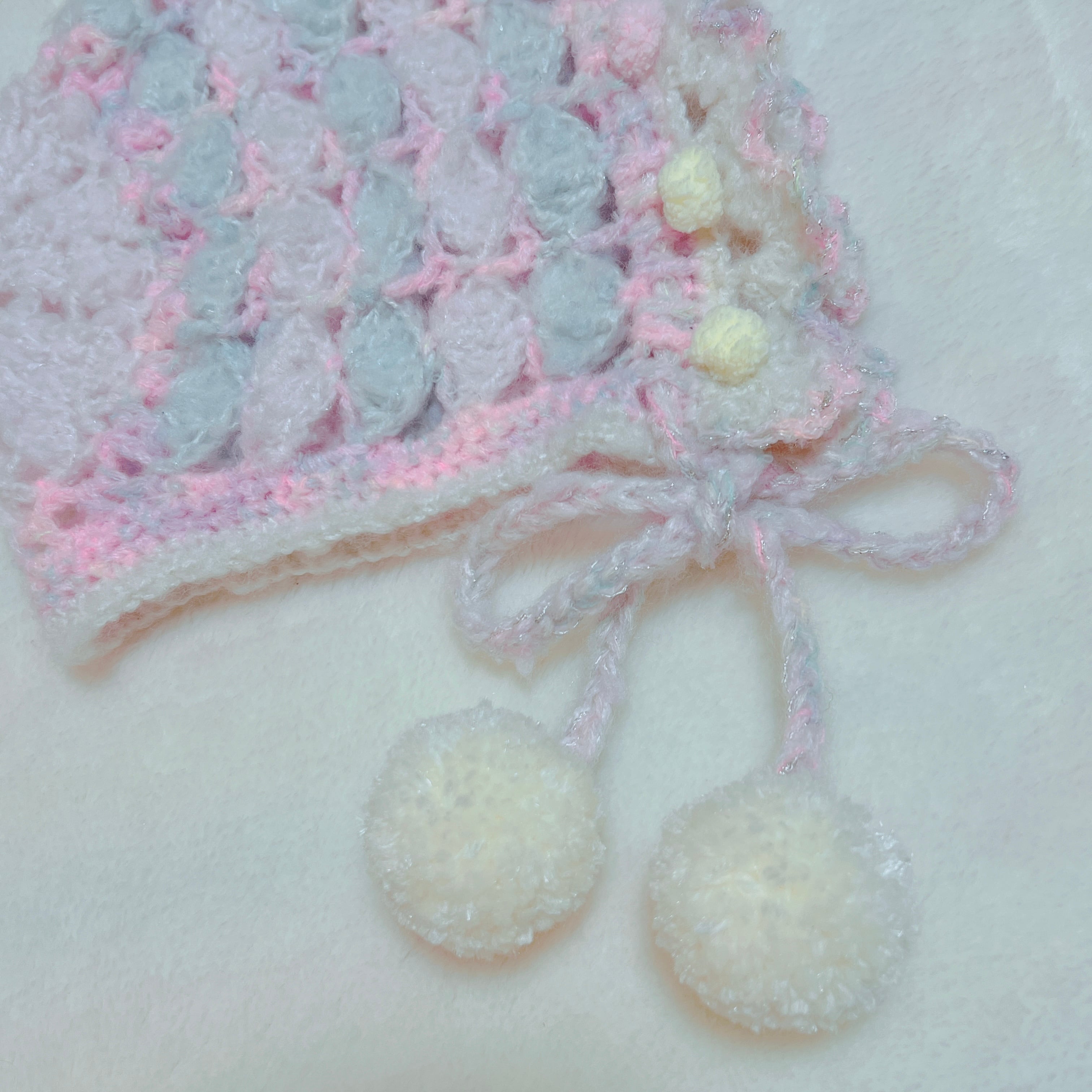 マシュマロのようなふんわり優しいパステルカラーのニットで編んだ大人用ニットボンネット。