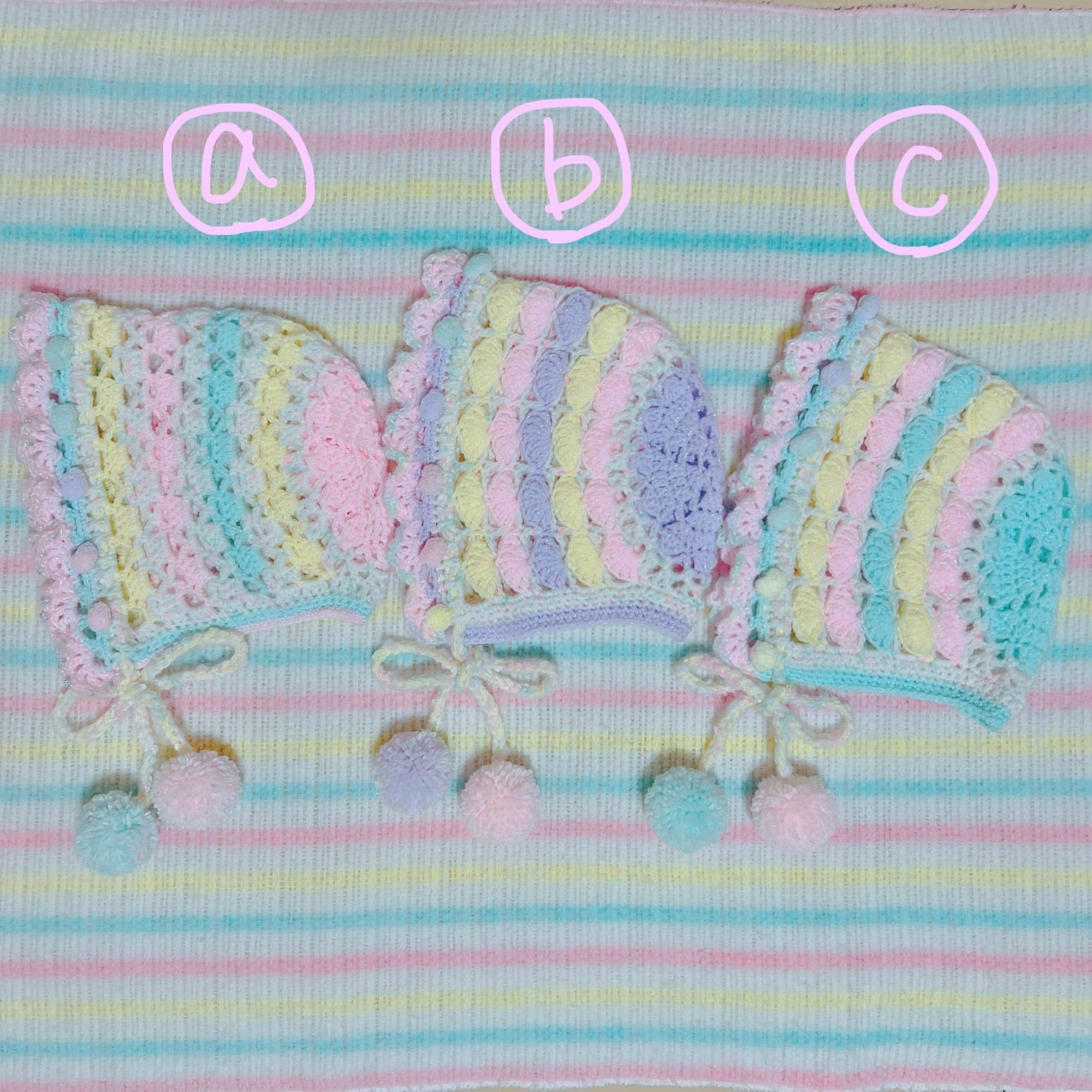 マシュマロのようなふんわり優しいパステルカラーのラメニットで編んだ大人用ニットボンネット。