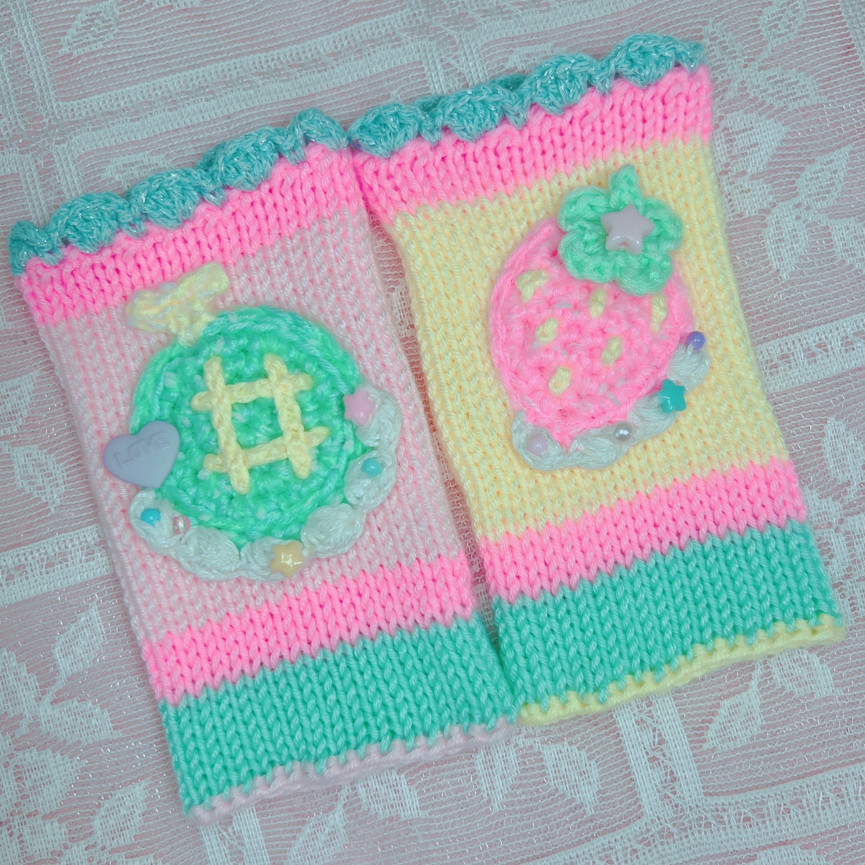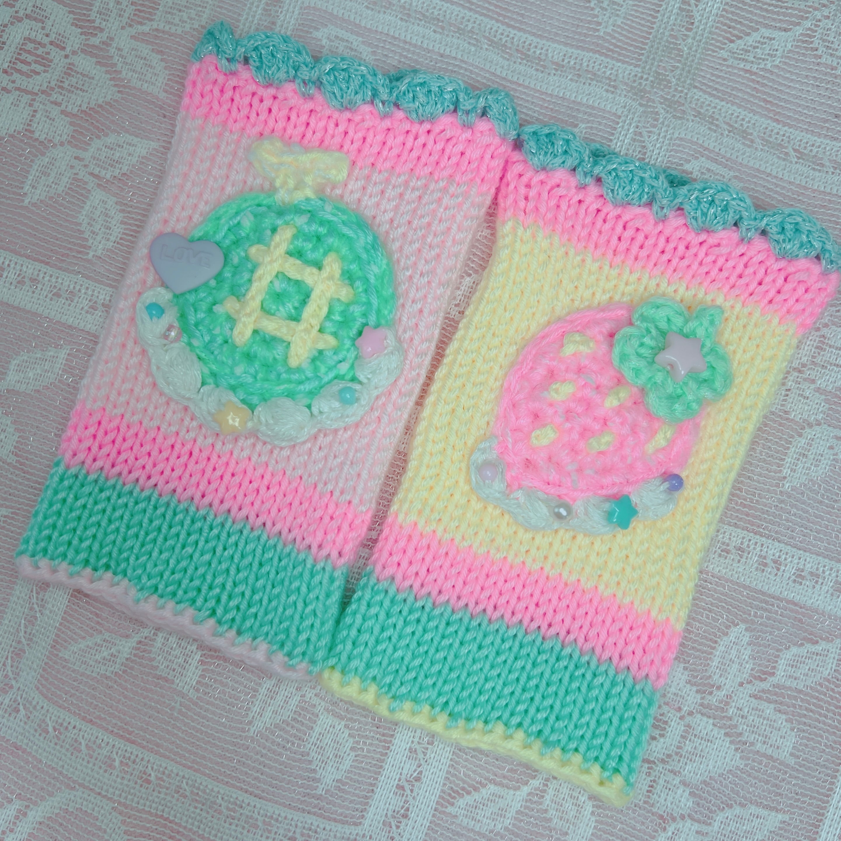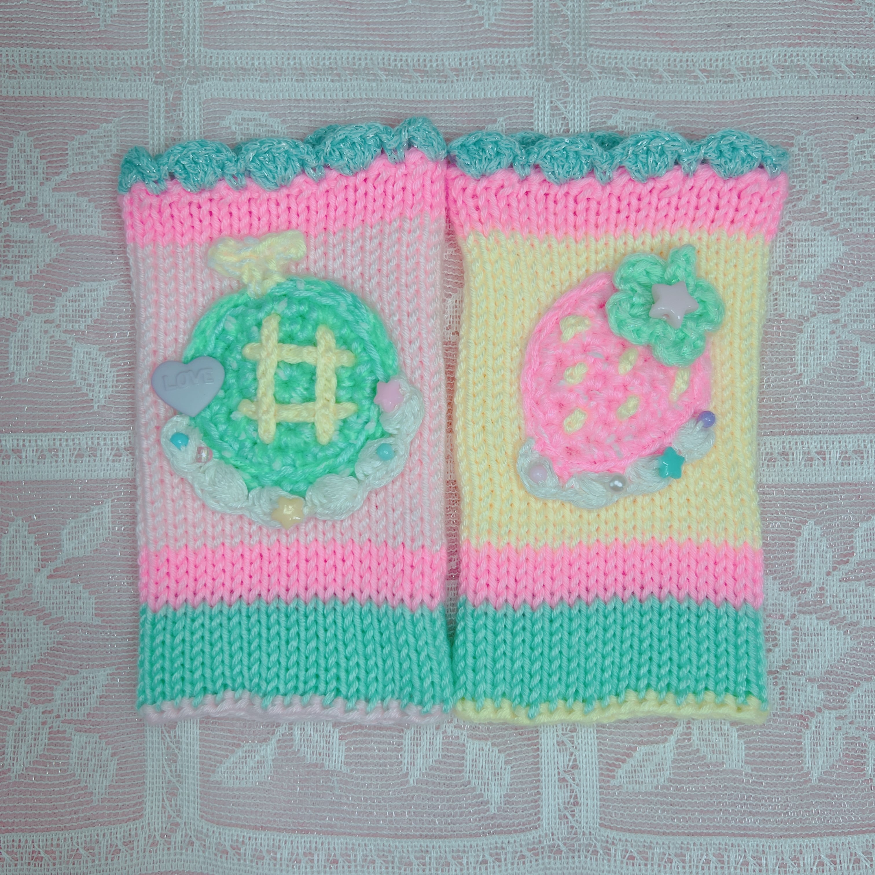 メロンといちごのキュートなモチーフをのせたハンドウォーマーです♪